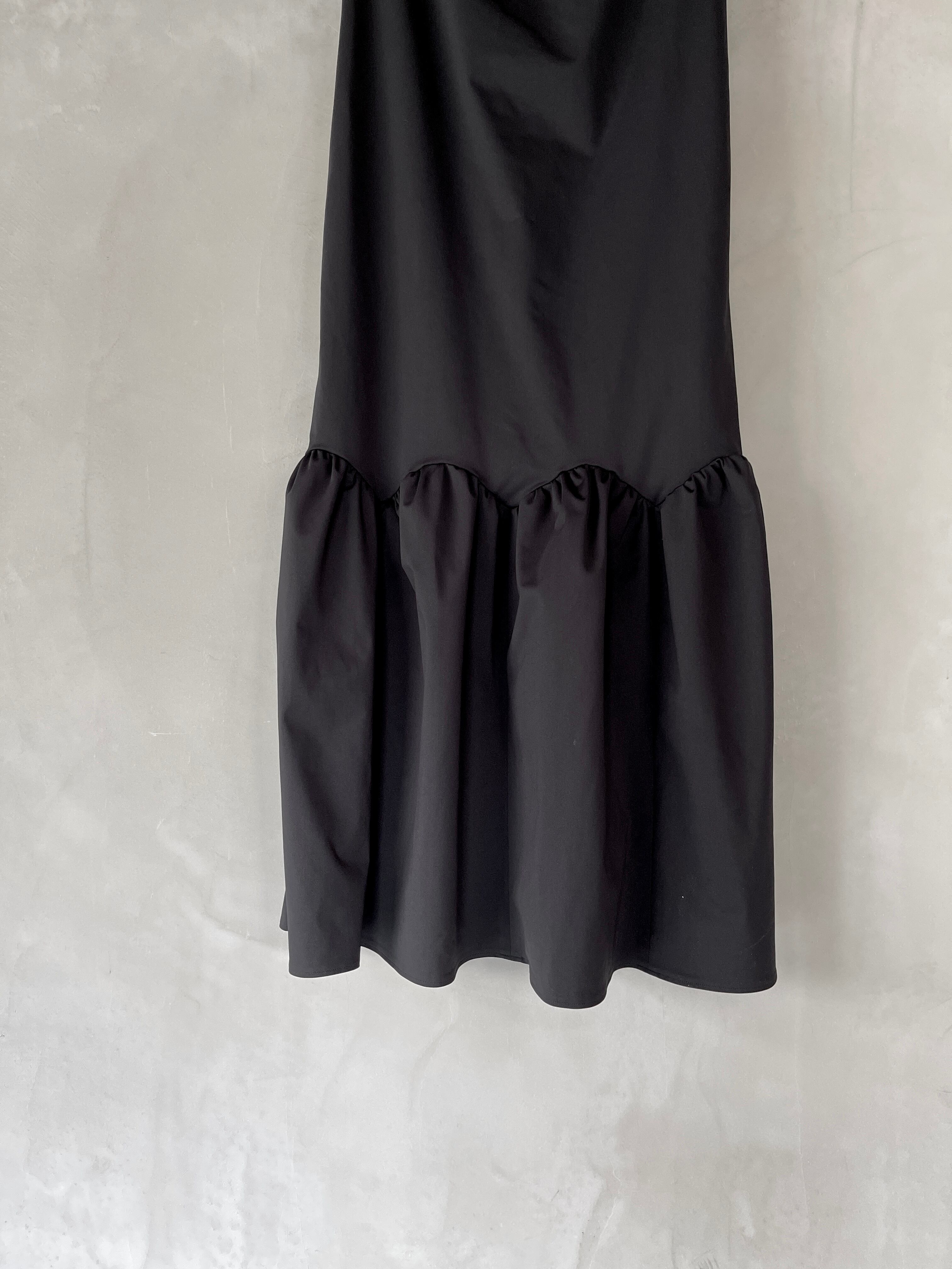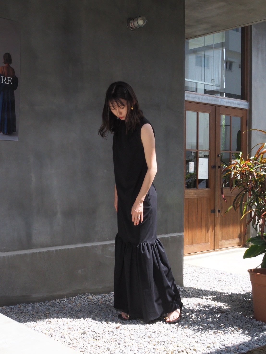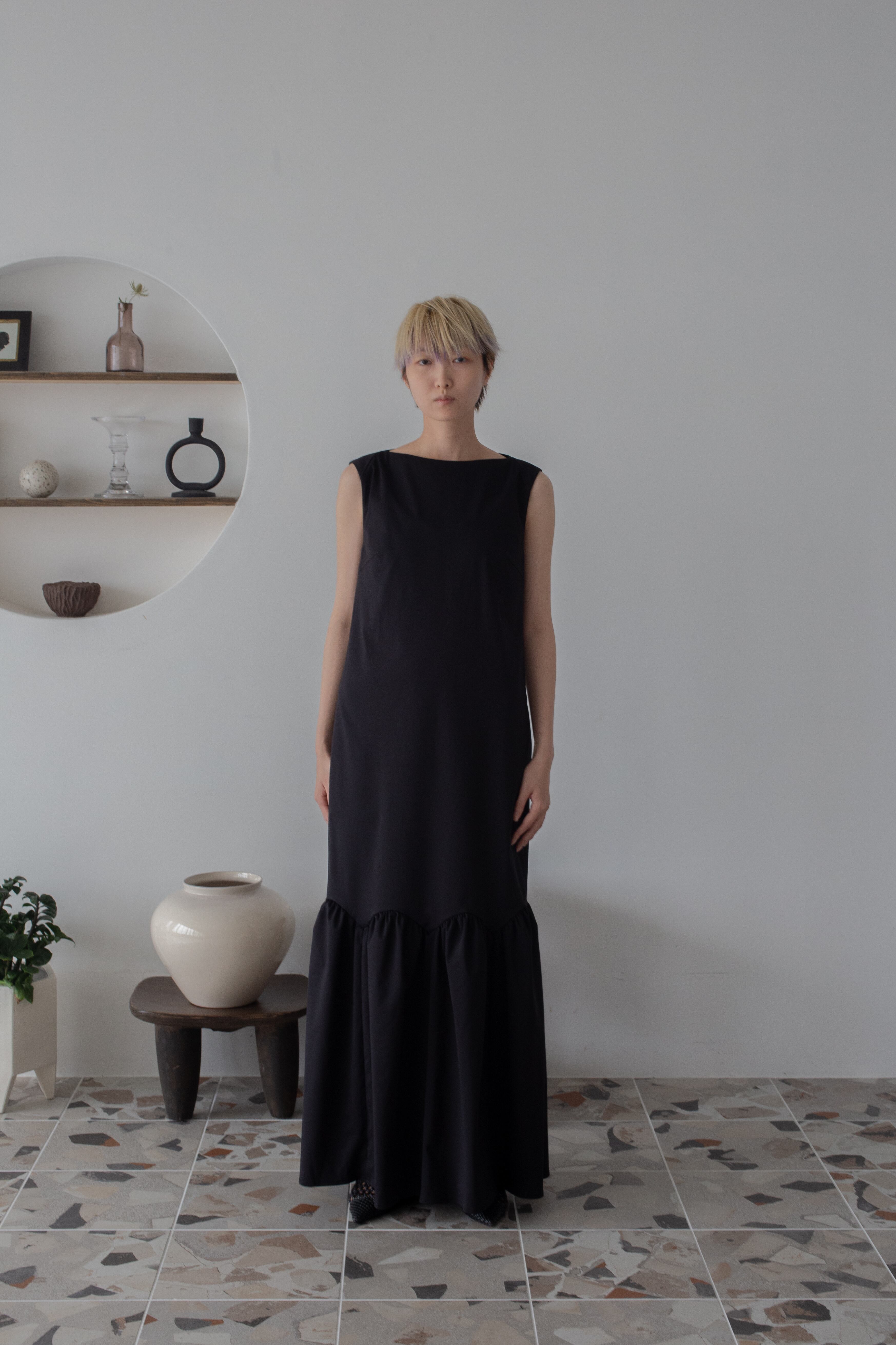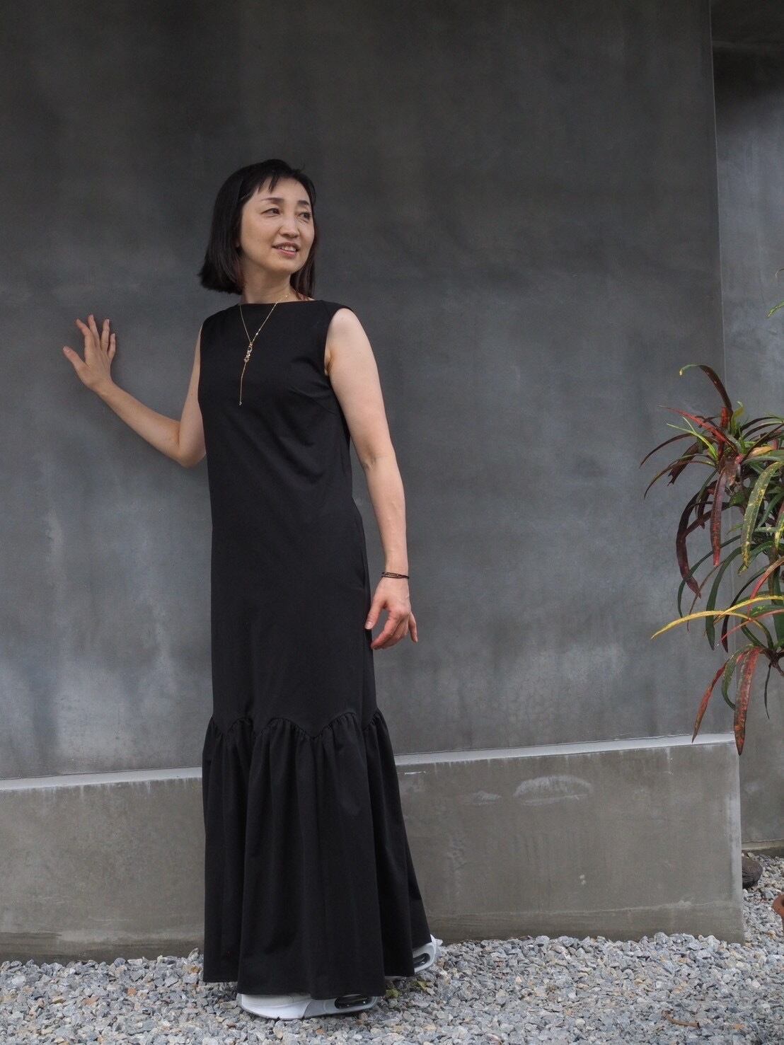 ストンと落ちるシルエットとボートネックが女性らしくもありながらクールな印象を与えてくれるロングワンピース。