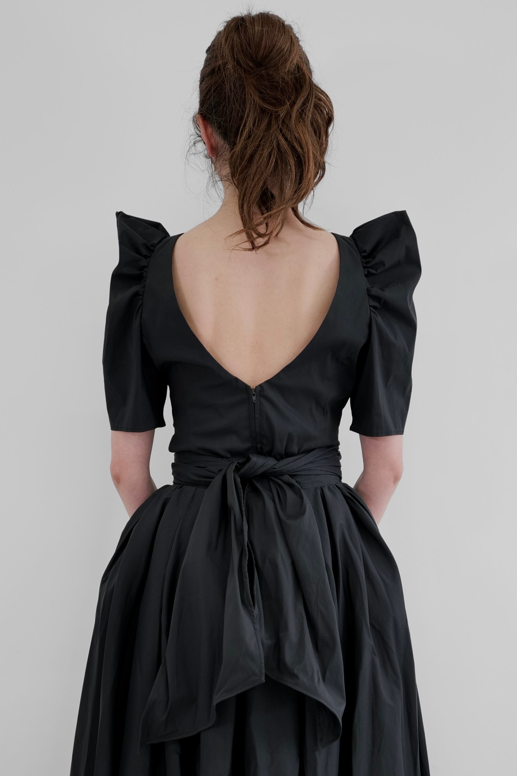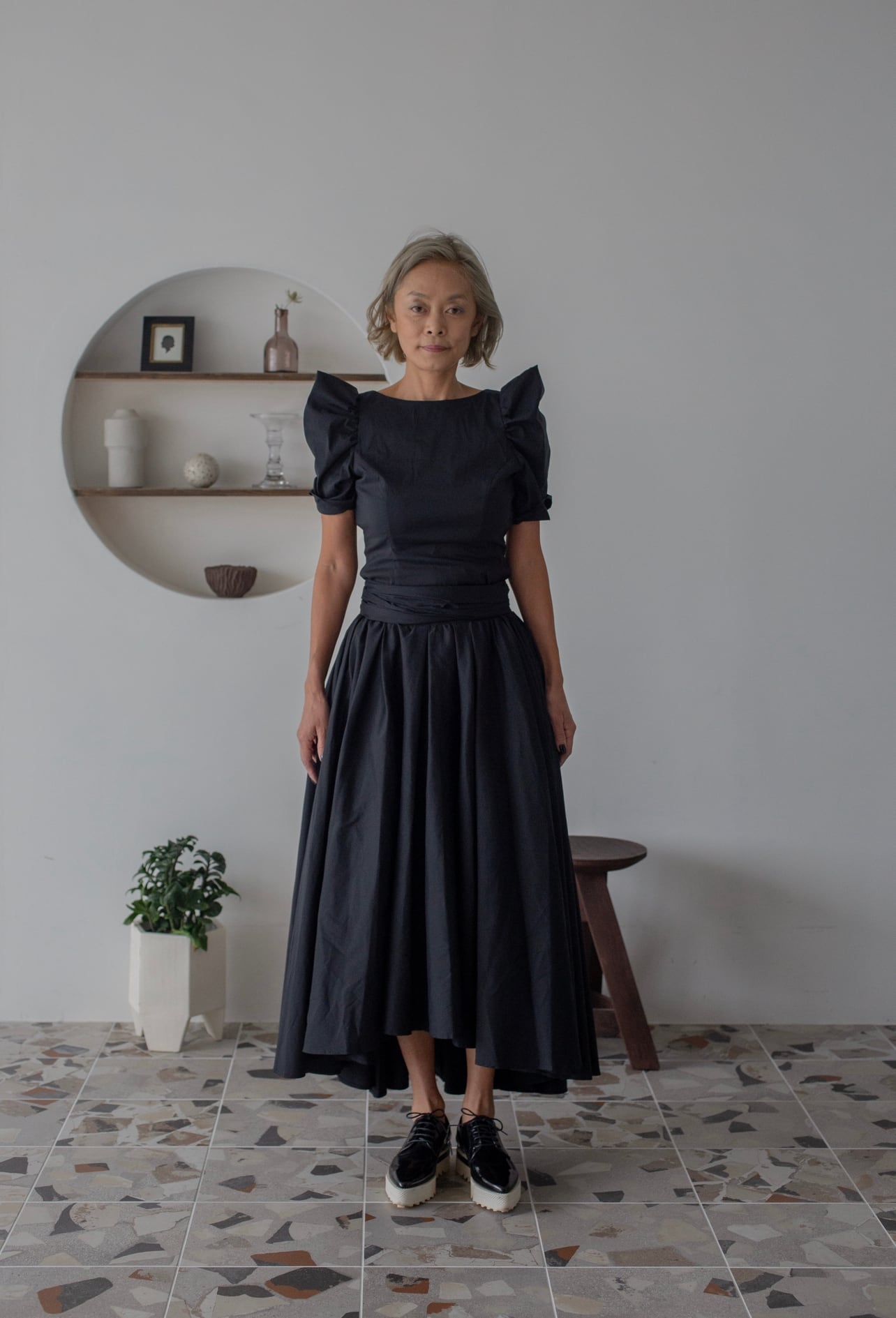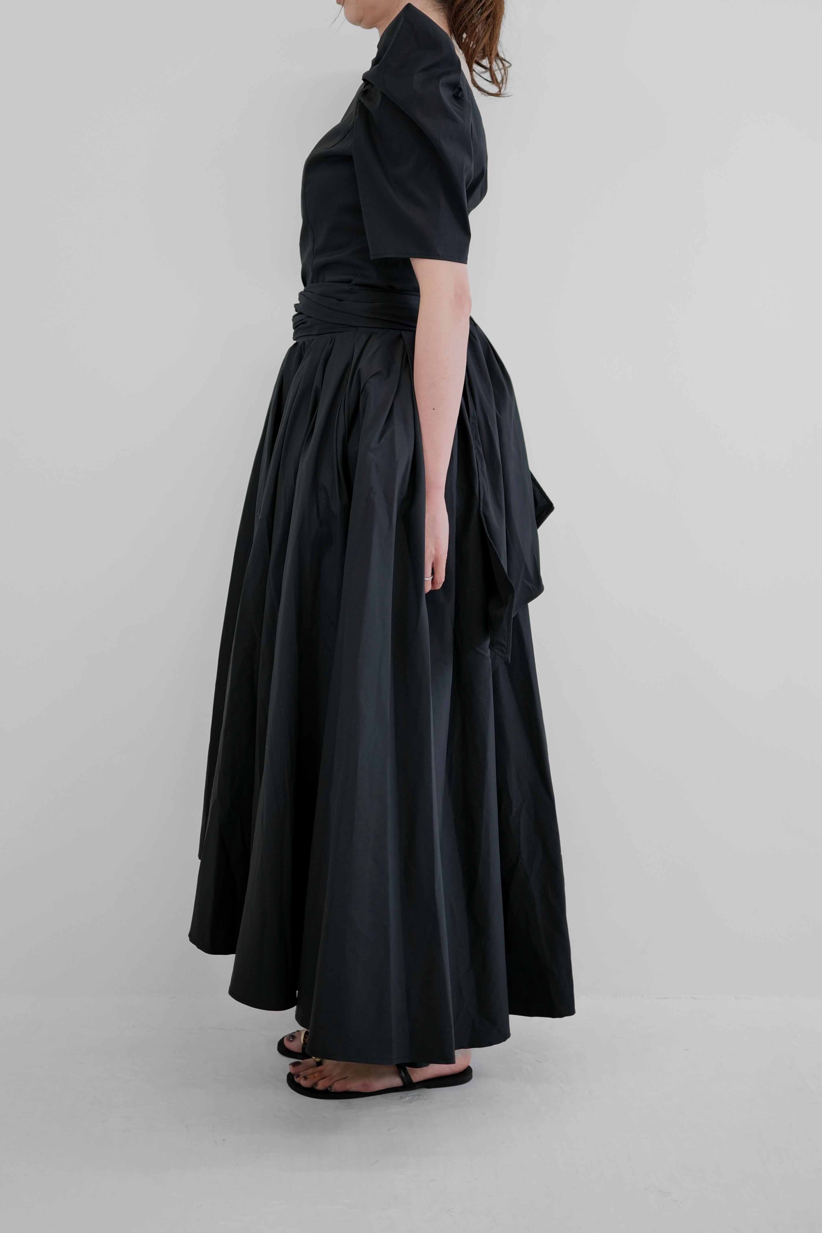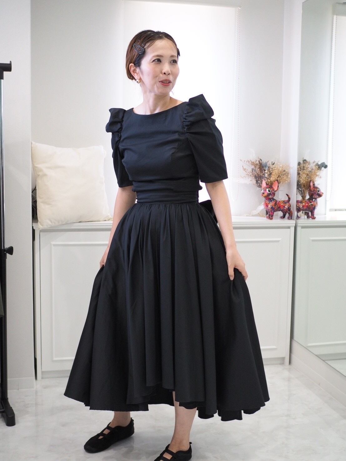 前後で長さの違うボリュームたっぷりのギャザースカート。両サイドのリボンはワイヤーを入れることで形をしっかりキープ。ビッグリボンを作っても、ラフに結びそのまま垂らしても。お好きなようにアレンジしていただけます。